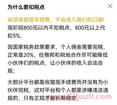 大家要明确一点,手续费跟扣税是2个完全不同的概念,手续费可以理解为平台为你服务收取的中介费或者服务费,是平台拿来盈利的,而扣税是国家政策要求,并不是平台收费的,至于为什么别的平台都是手续费,只能跟你说因为过去税收监管还不够完善,互联网上大部分的软件都存在偷税漏税的嫌疑,只有正规合法才能长久,所以任推邦平台在一开始就在正规性上立于不败之地。