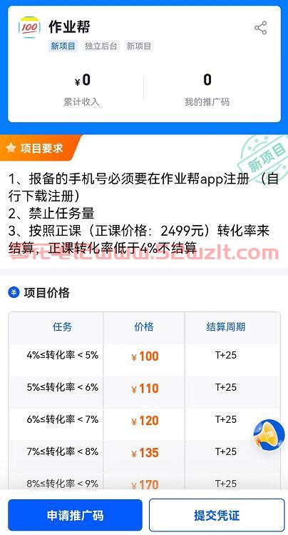 首先我们通过平台找到作业帮项目,然后申请报备推广码等待审核通过;